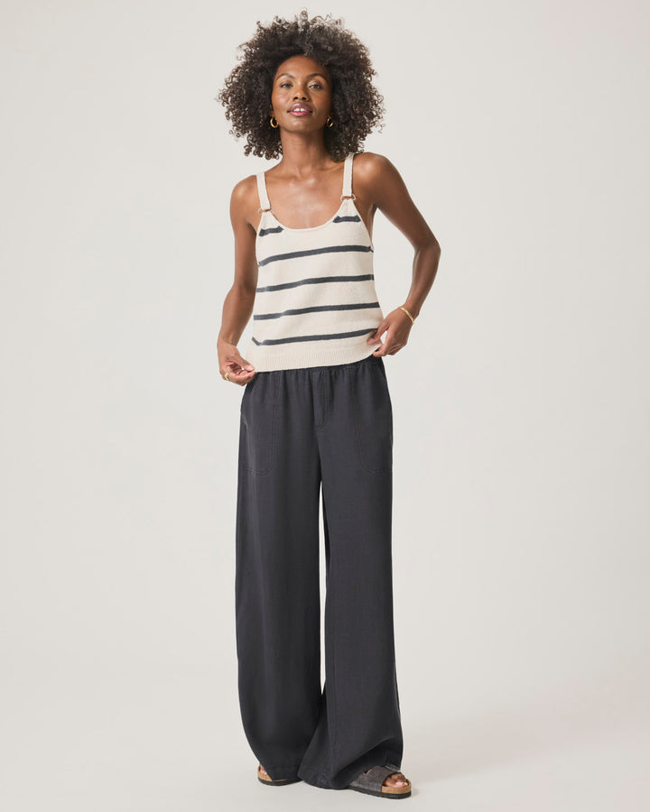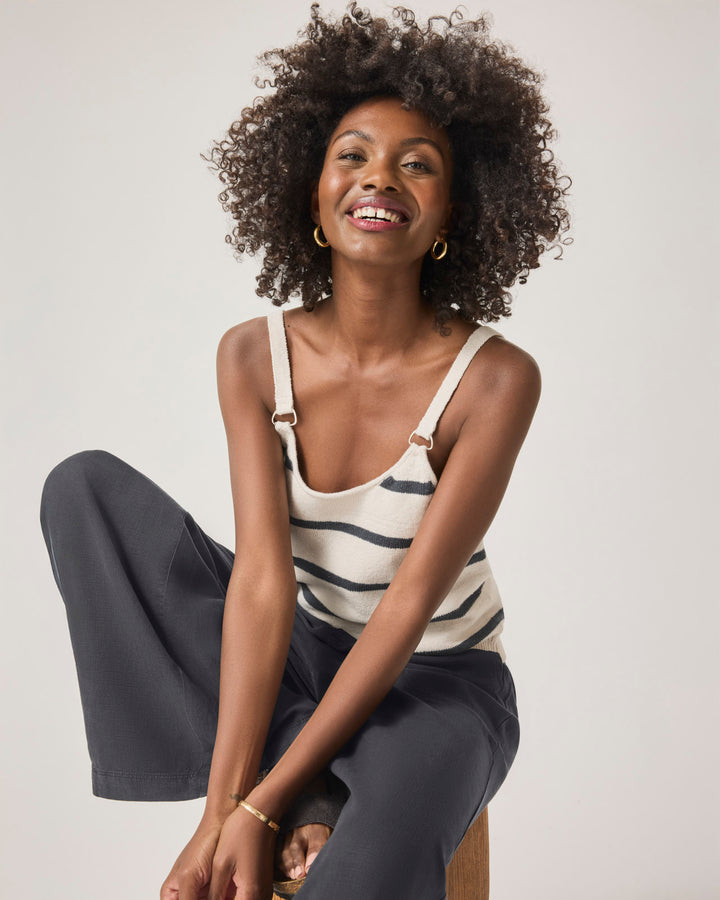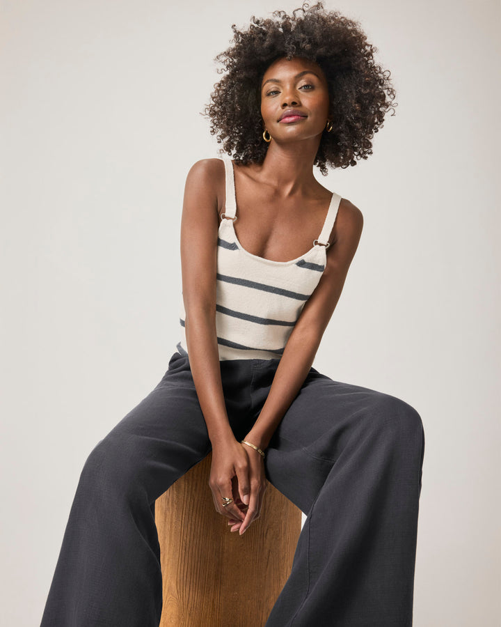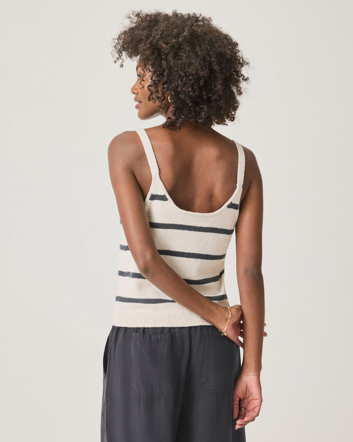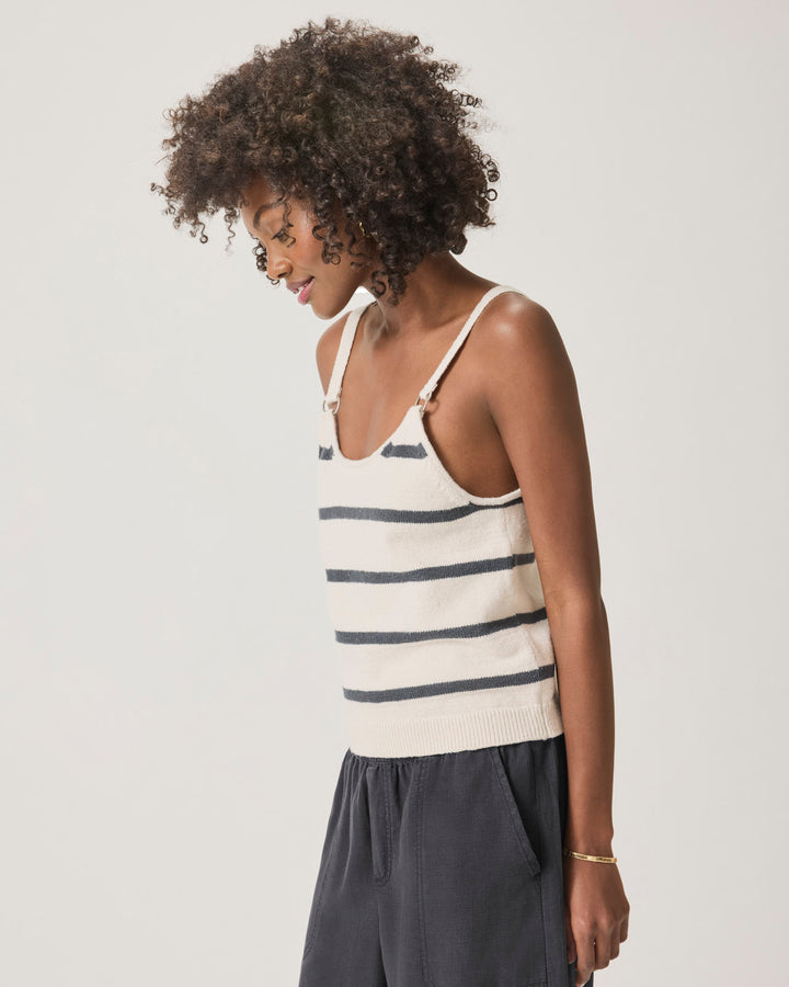Introducing the Daphne Stripe Sweater Tank from Splendid. This charming and fitted tank is ideal for your spring wardrobe. Made of a luxurious cotton blend, with a scoop neckline and fixed straps secured by a D-ring, this top is both stylish and comfortable. The subtle stripes and ribbed hem add a touch of elegance to your everyday look.