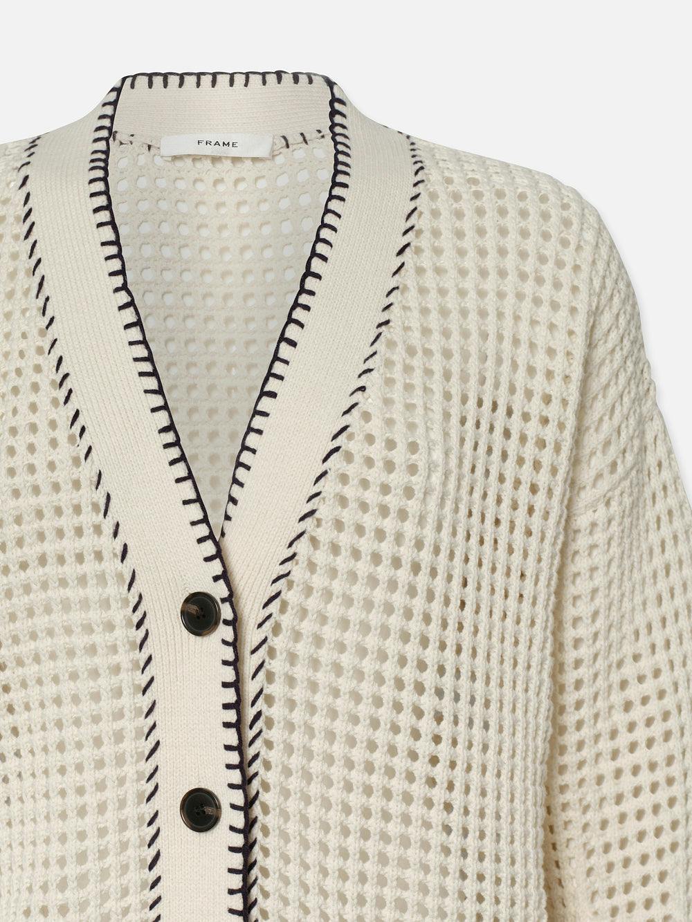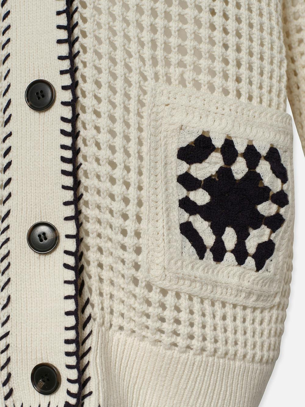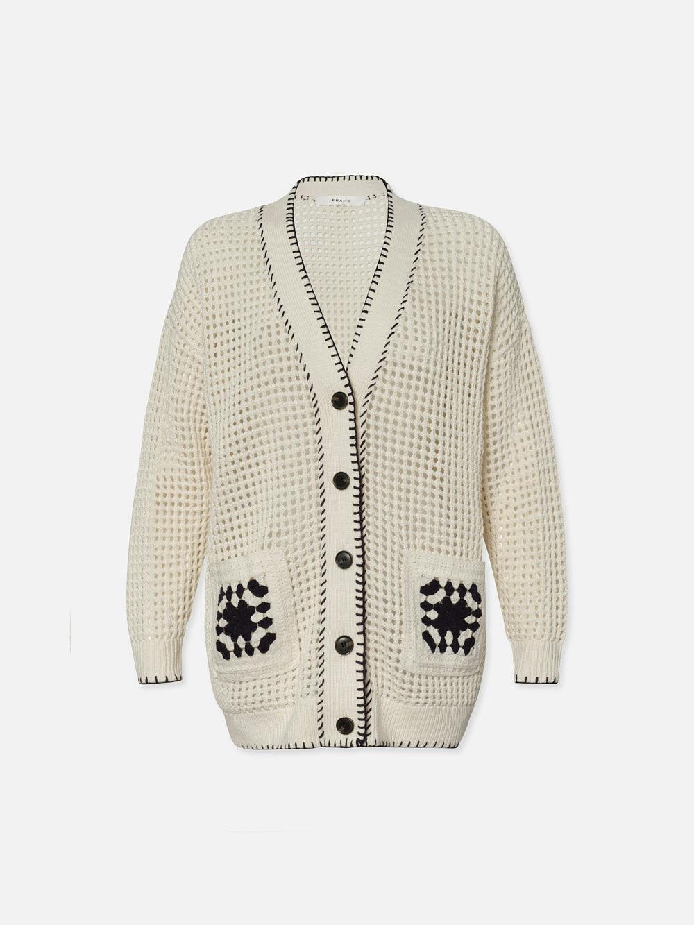 Indulge in classic elegance with FRAME's Crochet Pocket Cardi. This vacation-ready, updated grandfather cardigan boasts an oversized fit and chunky ribbed cuffs for ultimate comfort and style. Contrast navy stitching and oversized buttons add a sophisticated touch, while unique windowpane stitching on the pockets elevates this knit layer to a work of art.