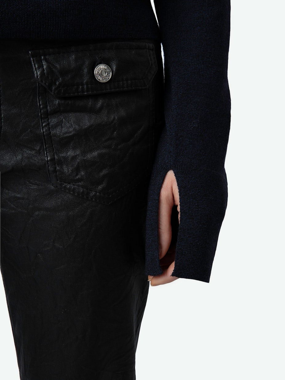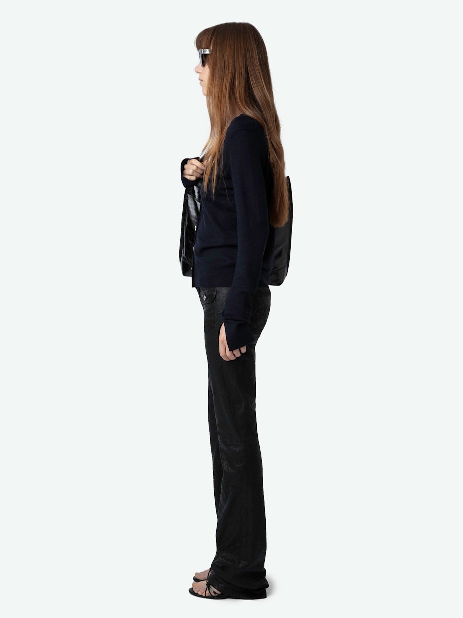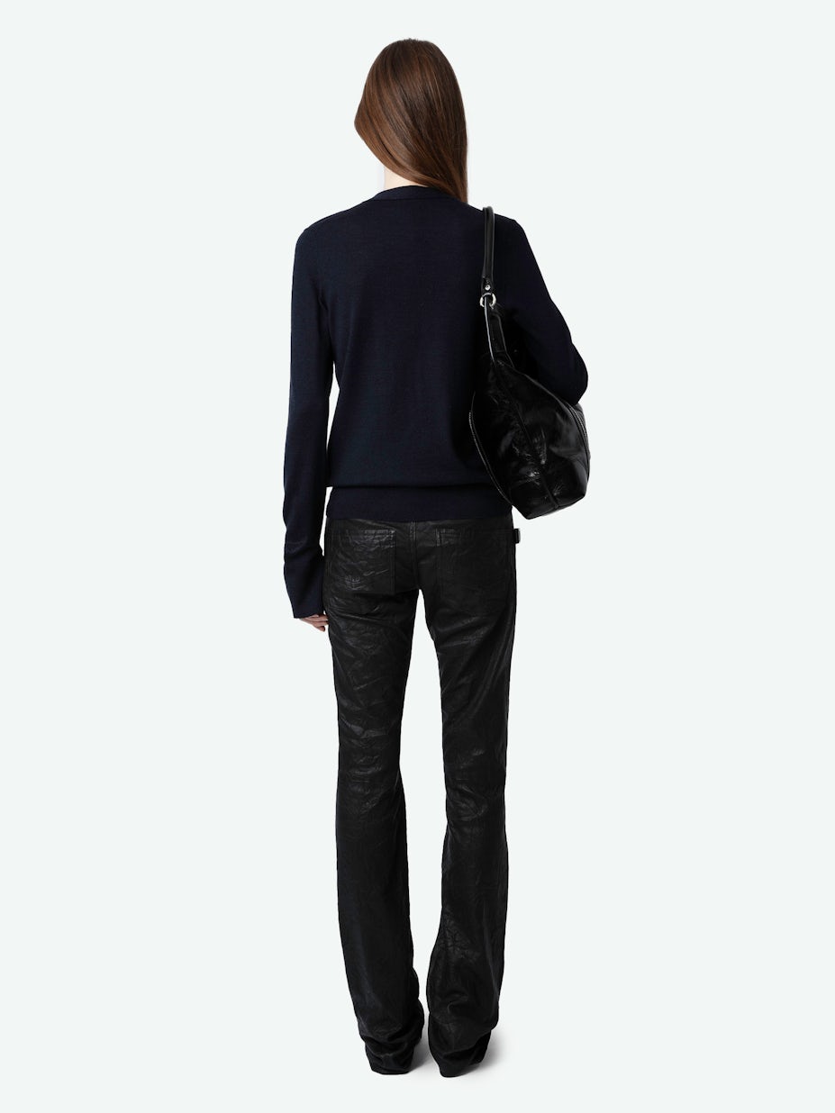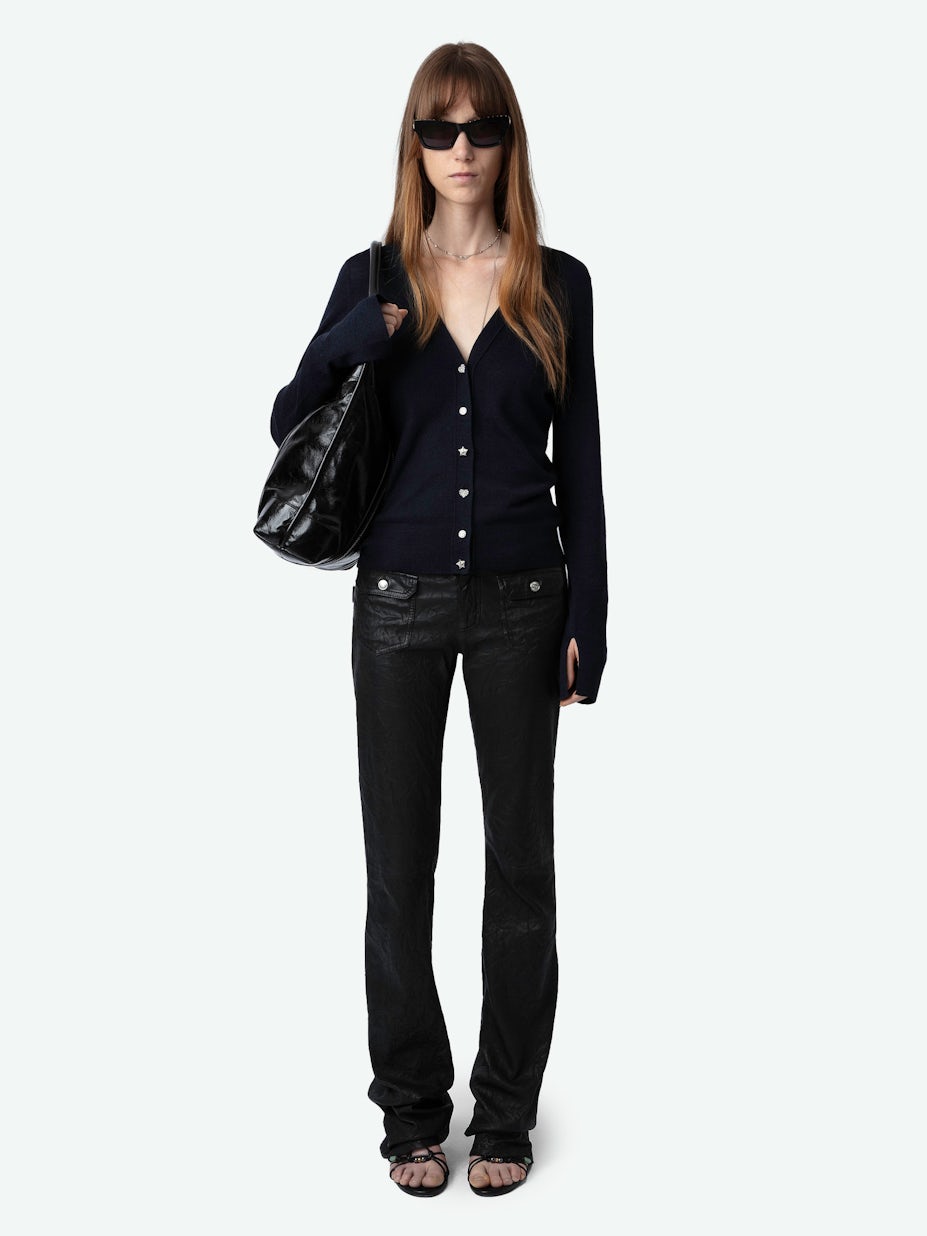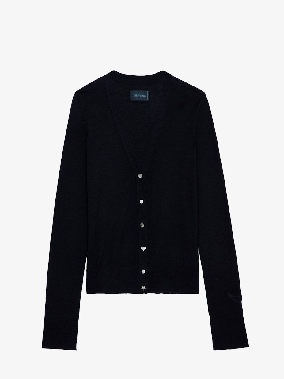Indulge in luxury with Zadig & Voltaire's Jemma We Cardigan. Crafted from 100% merino wool, this navy blue cardigan features long sleeves and exquisite diamante buttons. The embroidered wings on the back add a touch of elegance to this sophisticated piece. Elevate your wardrobe with this exclusive cardigan.