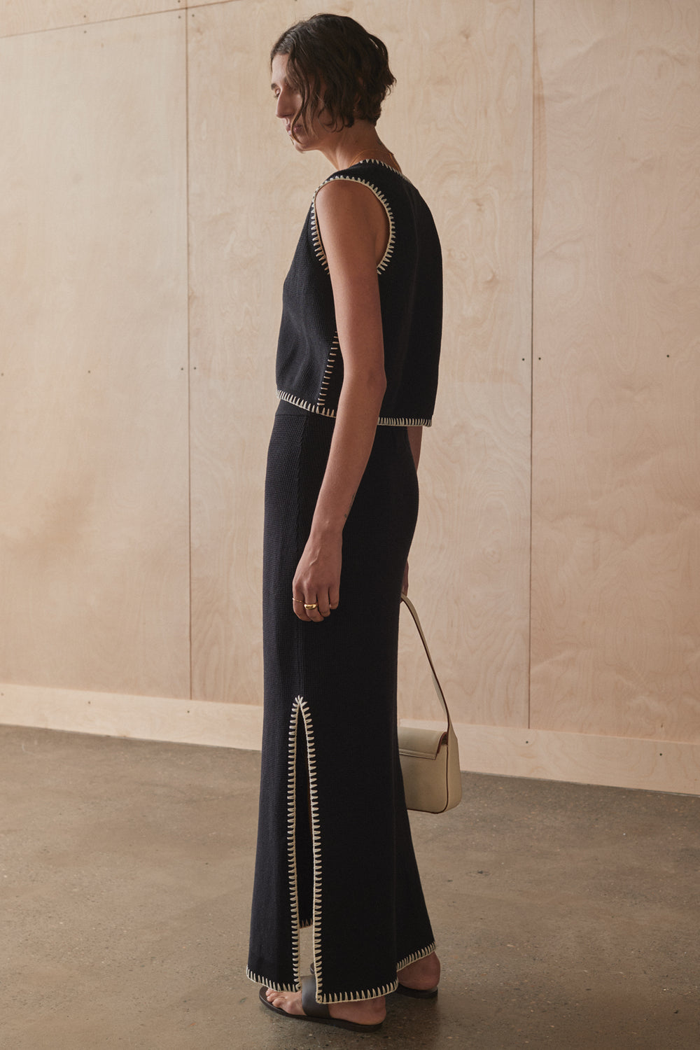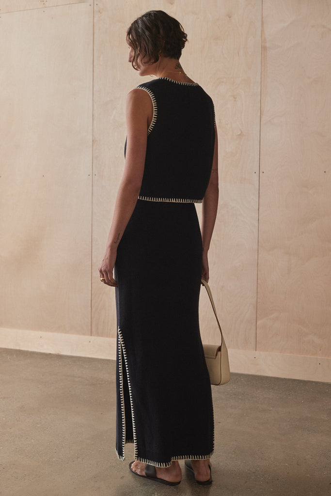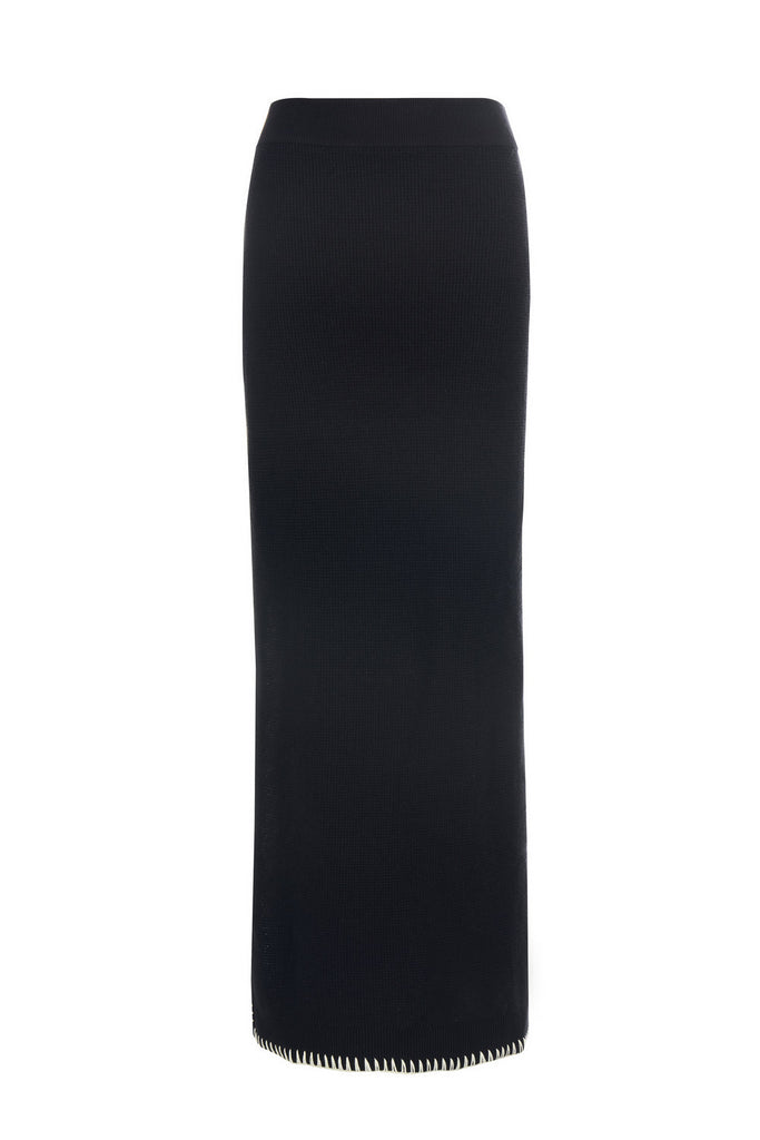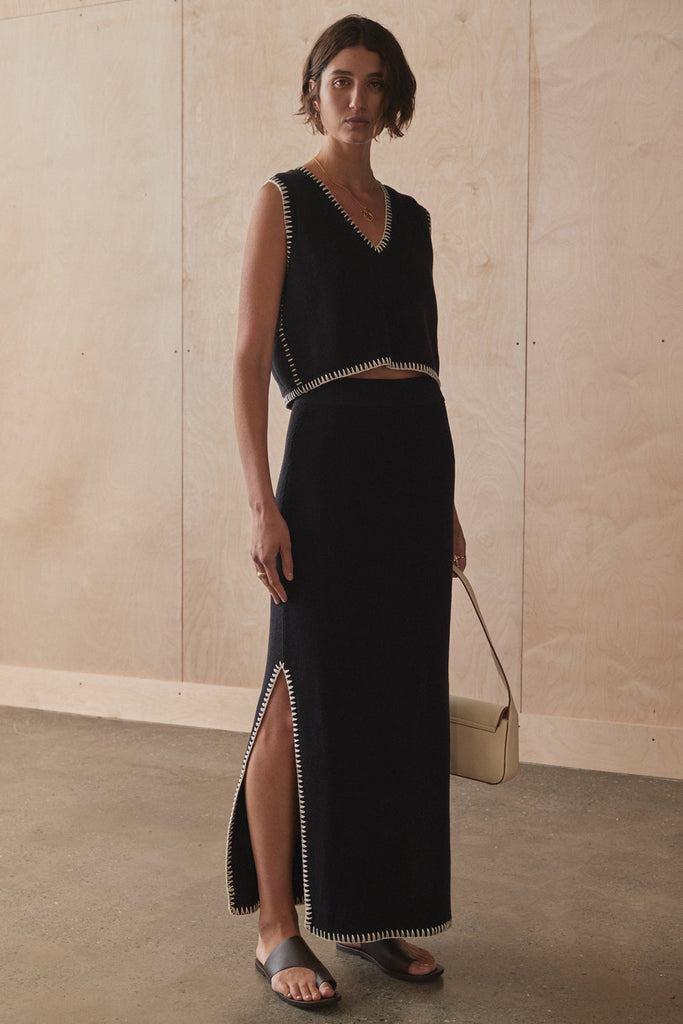 Indulge in luxury with the Maya Skirt in Noir from Sancia. This elegant knit skirt drapes beautifully, with a delicate contrast stitch along the hemline and slit. Pair it with the Rina Jumper or Bronwynne Top for effortless style and comfort year-round. Elevate your wardrobe with this sophisticated and exclusive piece.