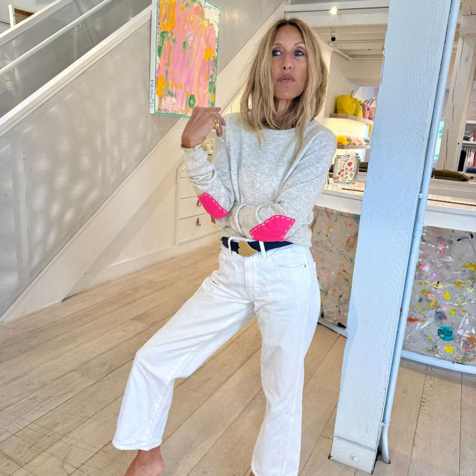 - Available in: Stardust light grey with hot pink heart elbow patches