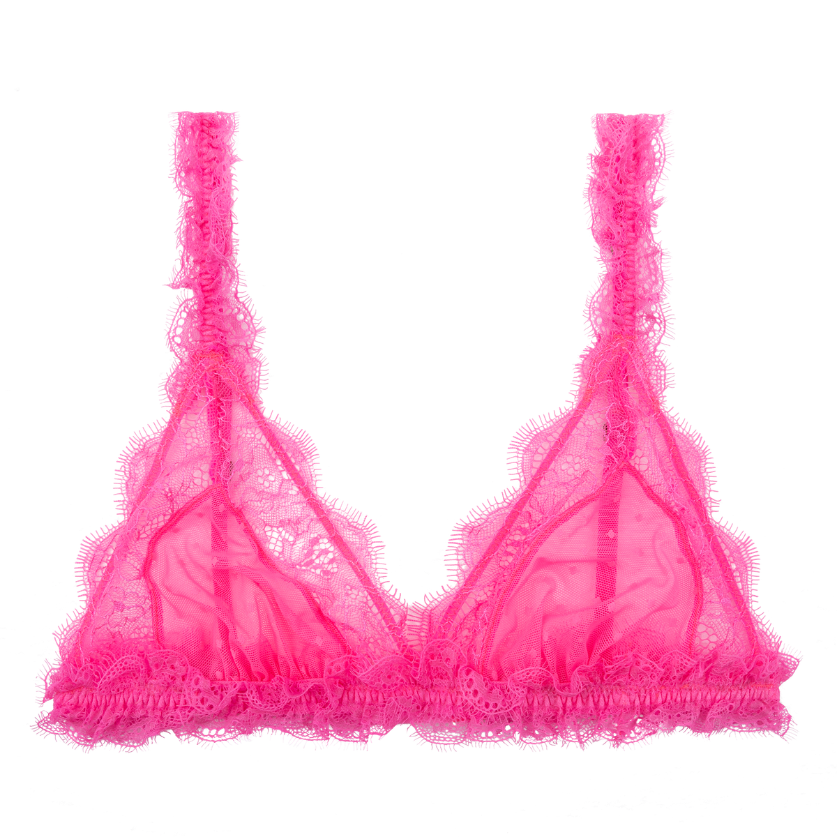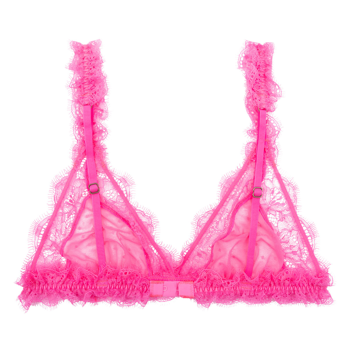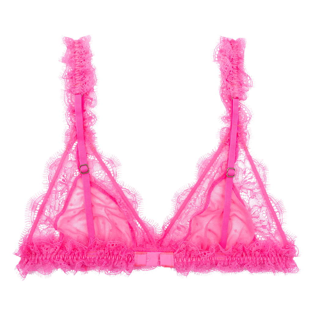 Indulge in luxury with the Love Stories Love Lace Delicate Triangle Bralette. Cut from soft, stretch mesh and adorned with a delicate dot pattern, this neon pink bralette features gathered detailing and a scalloped trim of floral lace for added elegance. Ruffled trims and adjustable shoulder straps provide a personalized fit while the elastic underband offers light support.