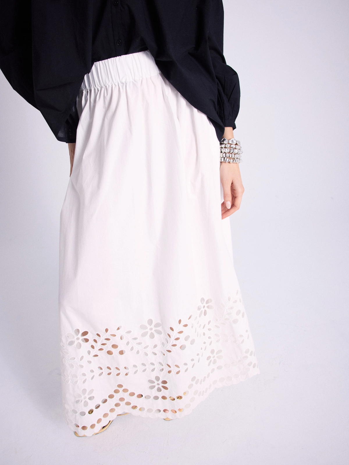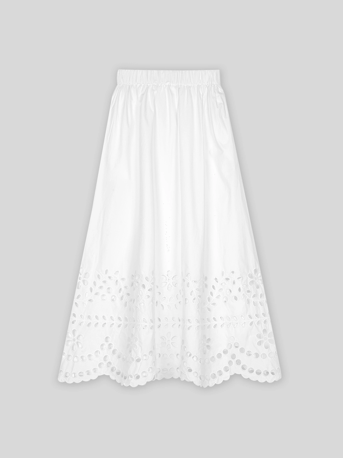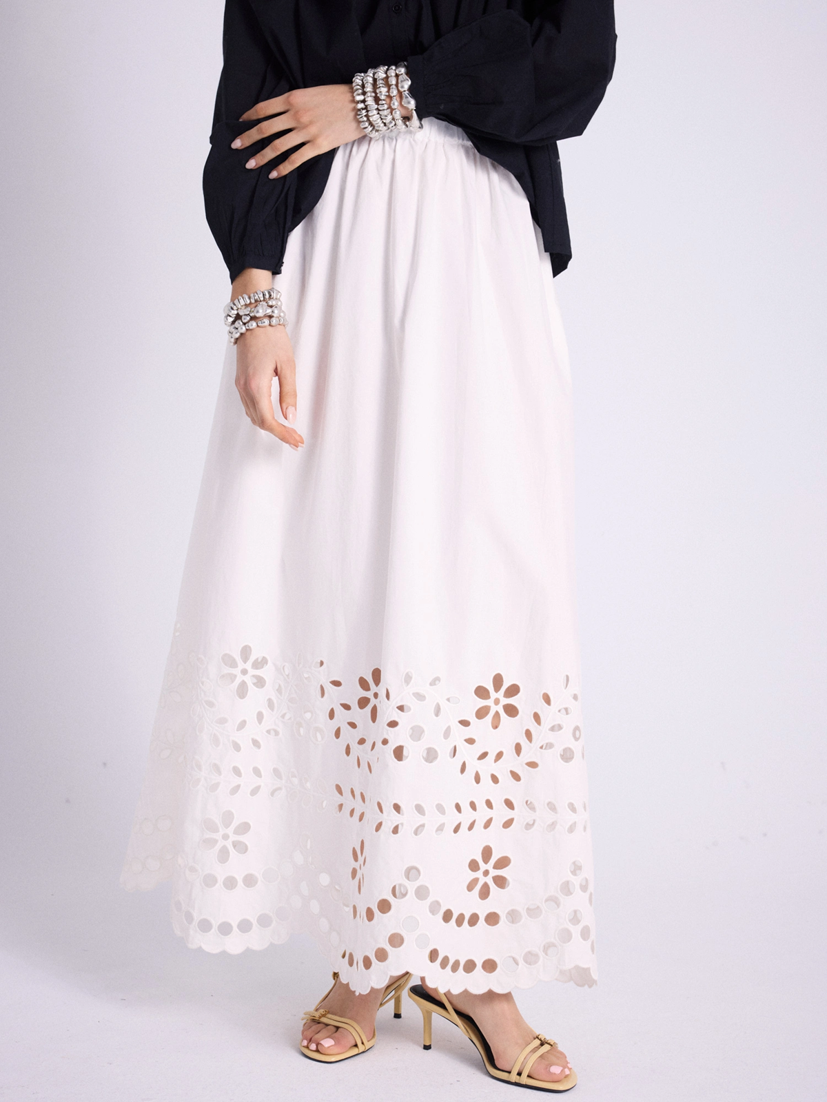 Elevate your wardrobe with Notshy's Ziane Cotton Skirt by Notshy. This sophisticated piece features delicate English embroidery in an elegant floral pattern. The comfortable elastic waistband ensures a perfect fit, while convenient side pockets add practicality to style. Its loose silhouette offers effortless movement and timeless grace for any occasion.
