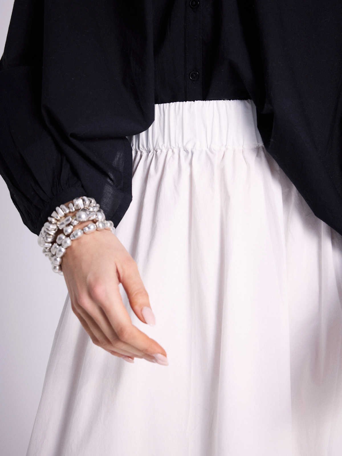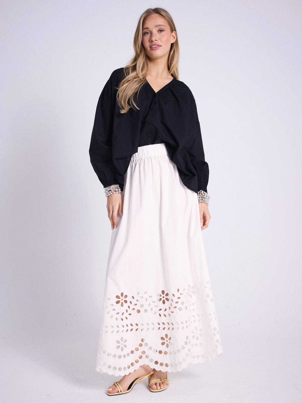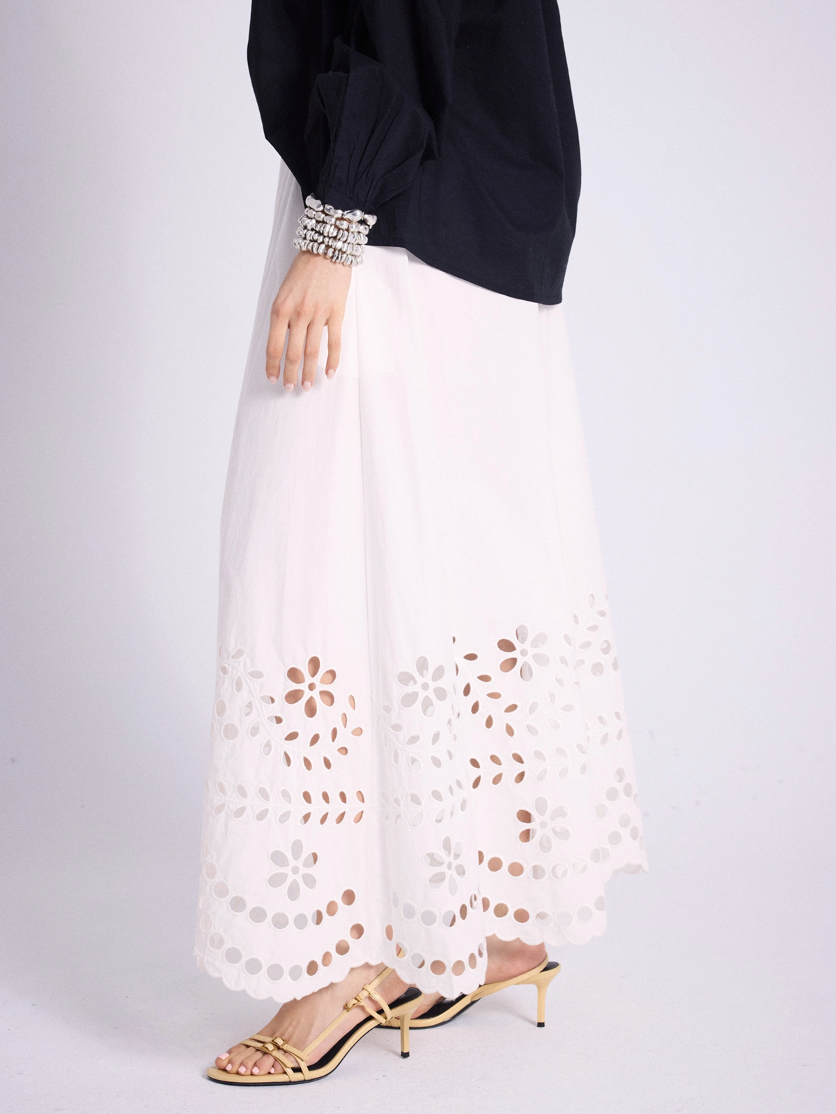 Elevate your wardrobe with Notshy's Ziane Cotton Skirt by Notshy. This sophisticated piece features delicate English embroidery in an elegant floral pattern. The comfortable elastic waistband ensures a perfect fit, while convenient side pockets add practicality to style. Its loose silhouette offers effortless movement and timeless grace for any occasion.