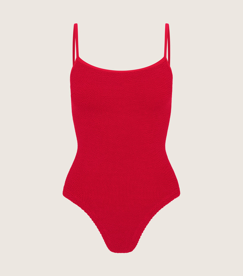 Elevate your poolside style with the Petra Swim Crinkle Red/Dtm from Hunza G. This 90s icon features a cheeky cut for a flattering look, perfect for seamless layering or making a bold statement in the sun. Embrace luxury and make a splash in this exclusive piece.