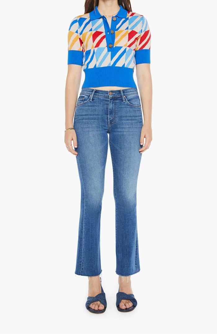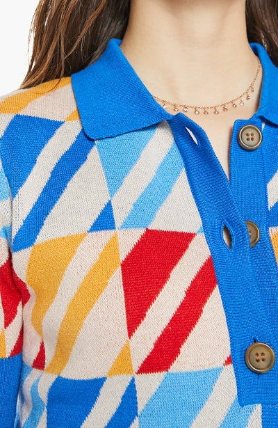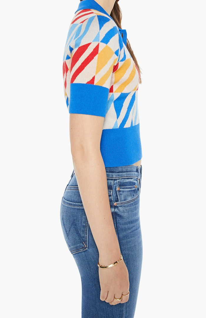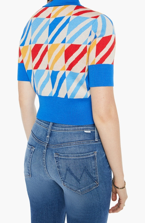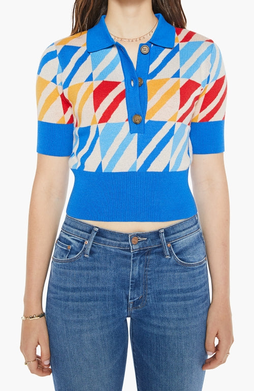 Indulge in luxury with The Dandy Henley from MOTHER. This collared blouse features short sleeves and a buttoned V-neck for a sophisticated touch. Its blend of cotton and baby alpaca provides softness and warmth, while the colorful geometric print and blue trim add a touch of elegance to the cropped, narrow fit.