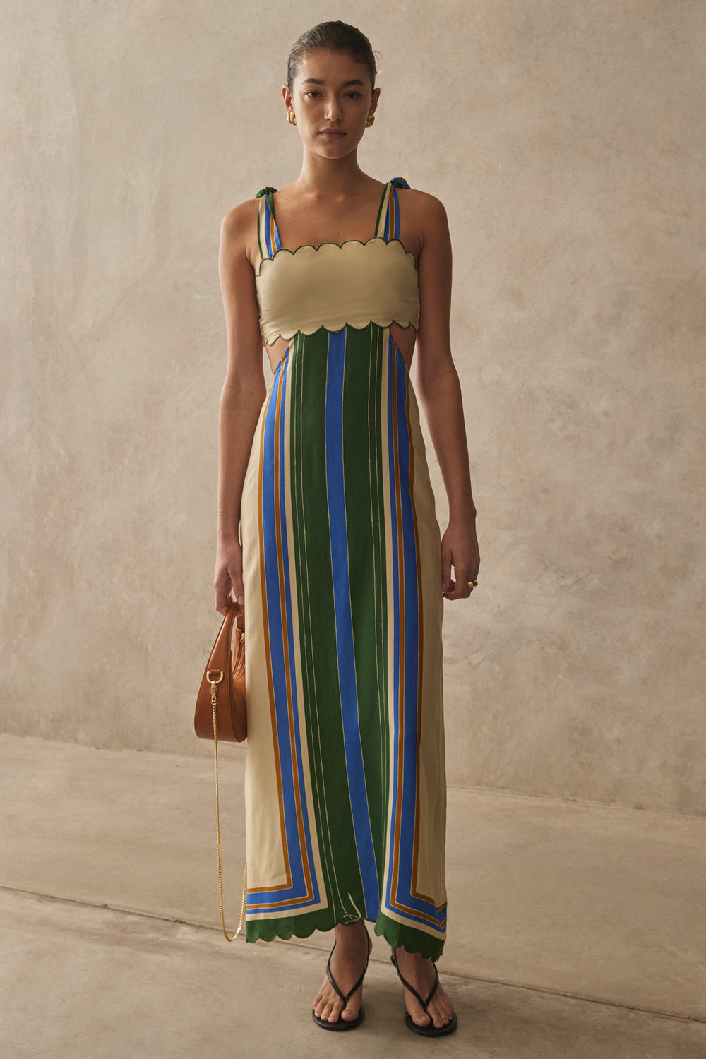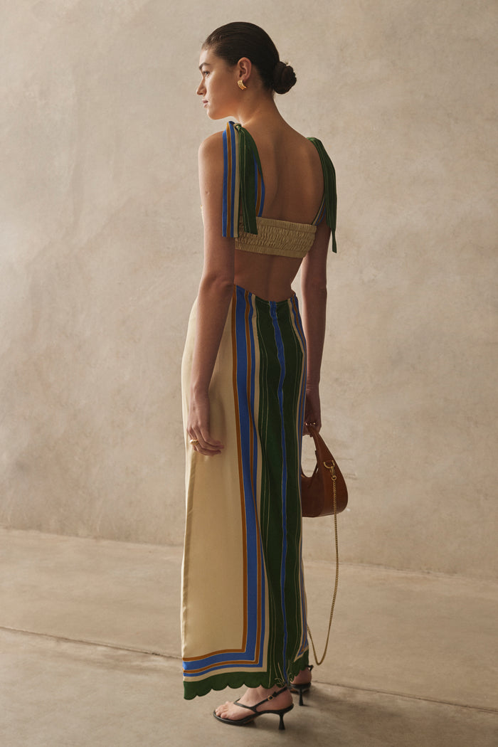 The Amory dress by Sancia embodies refined femininity with its meticulously crafted scalloped bust panel and delicate tie shoulder straps. Its ingenious cutout design creates an elegant two-piece illusion when viewed from behind, while thoughtful back shirring ensures a perfect balance of comfort and sophistication. This versatile piece effortlessly transitions from day to evening occasions with graceful ease.
