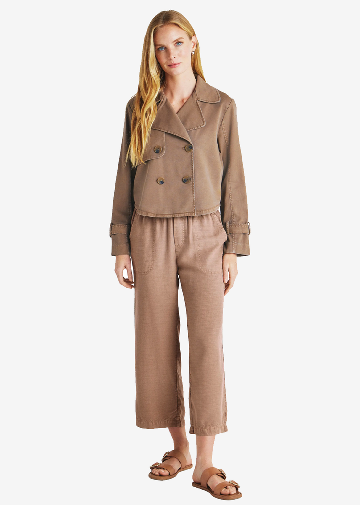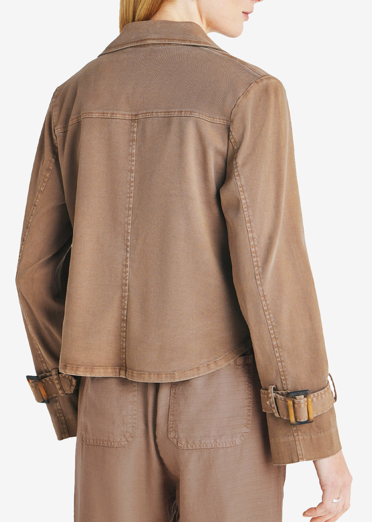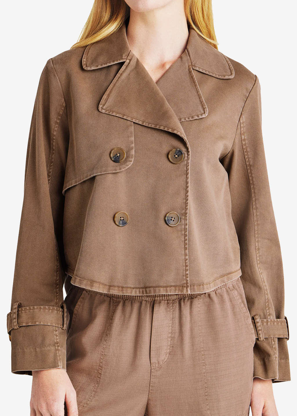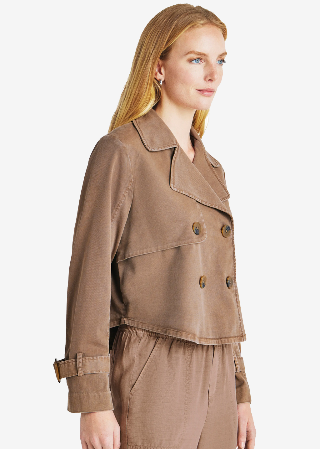 Experience the ultimate comfort and style with our Splendid's Portia Jacket. Made from stretch twill for a lightweight feel, this cropped trench features an enlarged notch collar, double-breasted buttons, and adjustable buckle sleeve cuffs. Its versatile design allows for layering over chunky knits and its shirttail hem adds a flattering touch.