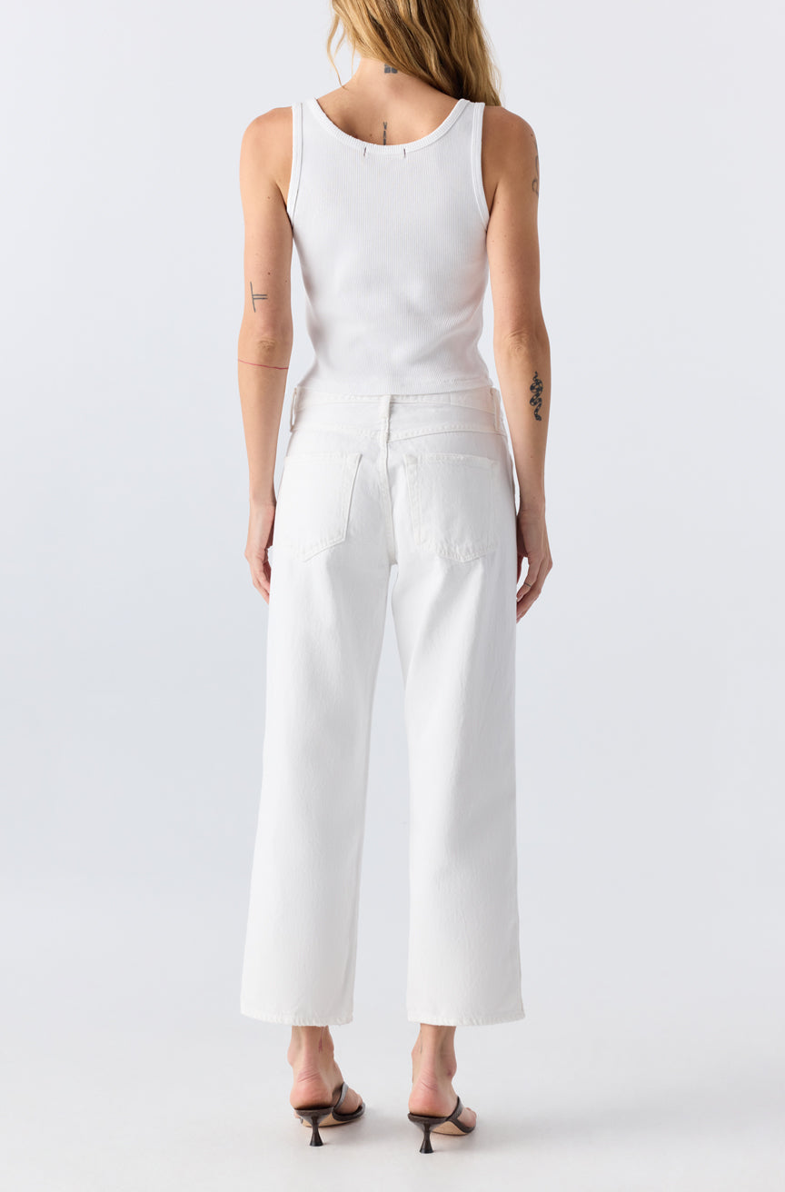 Introducing a new level of comfort and style with our Billie Jeans in Albabaster. Designed by AMO, these cropped, wide, straight-leg jeans feature a mid-rise for a relaxed look and thoughtful distressing for added character. Embrace luxury and ease in these effortless jeans.