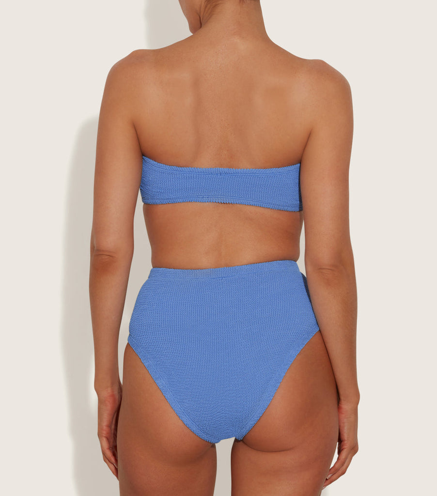 Indulge in vintage glamour with Ruby Bikini Crinkle Cornflower from Hunza G. The bow-shaped bandeau top and high-waisted bottoms exude retro charm, while the crinkle texture adds a touch of luxury. Embrace your inner fashionista with this exclusive piece.