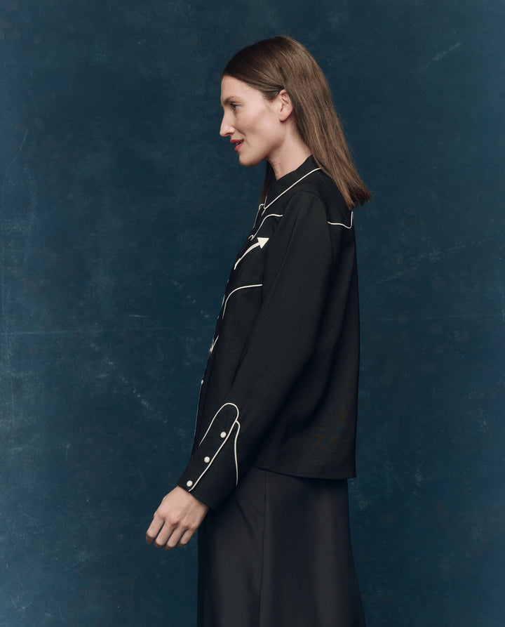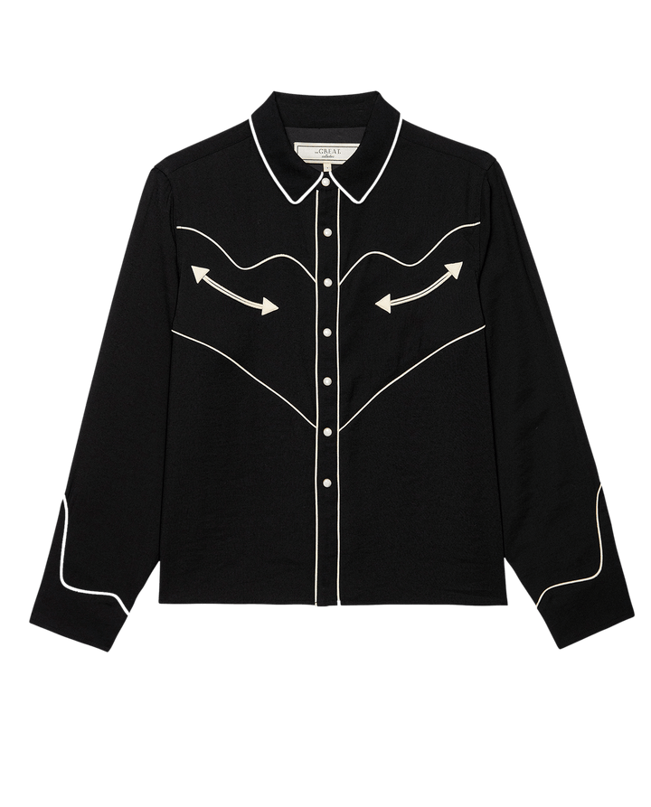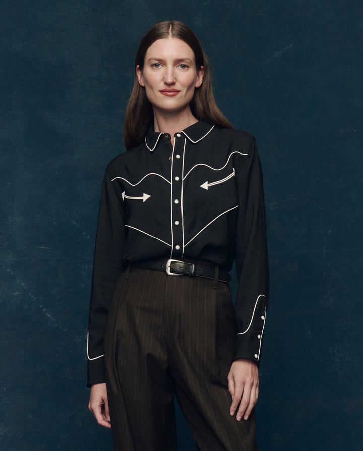 The Western Shirt by The Great blends classic rodeo heritage with refined femininity. Crafted from sleek rayon twill, it drapes smoothly with a subtle sheen, offering effortless movement. Signature details like the curved western yoke, piped seams, tall cuffs, and genuine pearl snaps evoke vintage authenticity. Its boxy silhouette and tapered cuffs balance comfort with elegance, while the tailored collar adds a polished finish. A versatile piece that pairs perfectly with denim, it captures the spirit of the American West with a sophisticated edge.