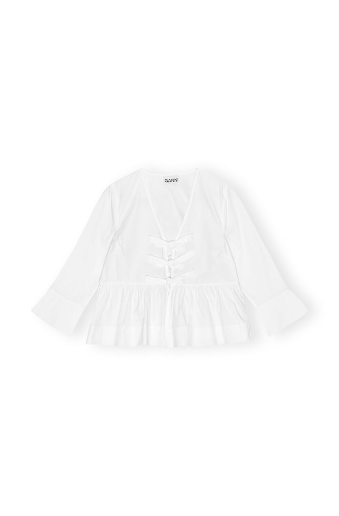 Esta blusa peplum con cordón de popelín de algodón blanco está diseñada para un ajuste relajado y presenta un escote en V con cordones y mangas hasta los codos con una ligera abertura.