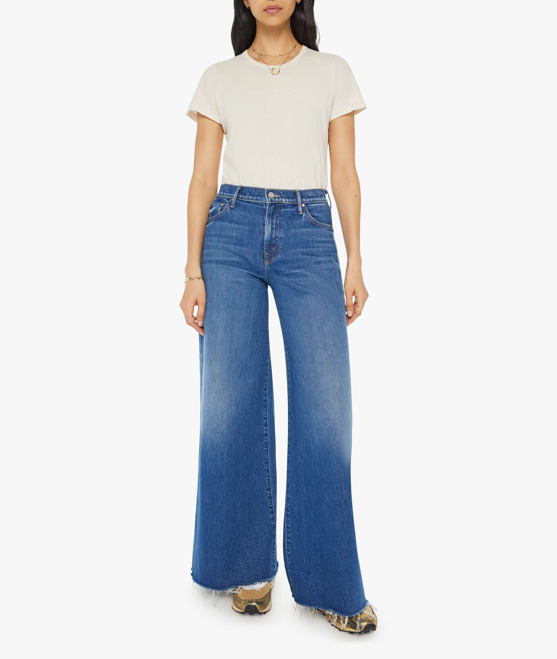 MOTHER's Swisher Sneak Fray Jeans - the pinnacle of luxury denim. Crafted from semi-rigid SUPERIOR denim, these jeans feature a high rise, slouchy fit, and frayed hem for a contemporary twist. With a long 32-inch inseam, these super wide-leg jeans offer a flattering silhouette. Available in the striking mid-blue wash of Punch Buggy with subtle whiskering and fading at the knee. Elevate your wardrobe with these exclusive jeans.