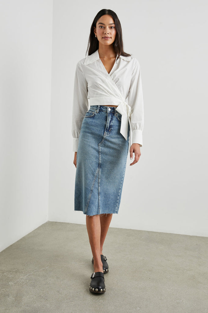 Rails, Découvrez une touche moderne à la chemise blanche intemporelle avec notre haut Bali. Doté d'une silhouette courte, d'un col à volants ludique et d'un détail portefeuille complet à la taille, ce haut ajoute une touche d'avant-garde à n'importe quelle tenue. Élevez votre style avec cette pièce polyvalente.