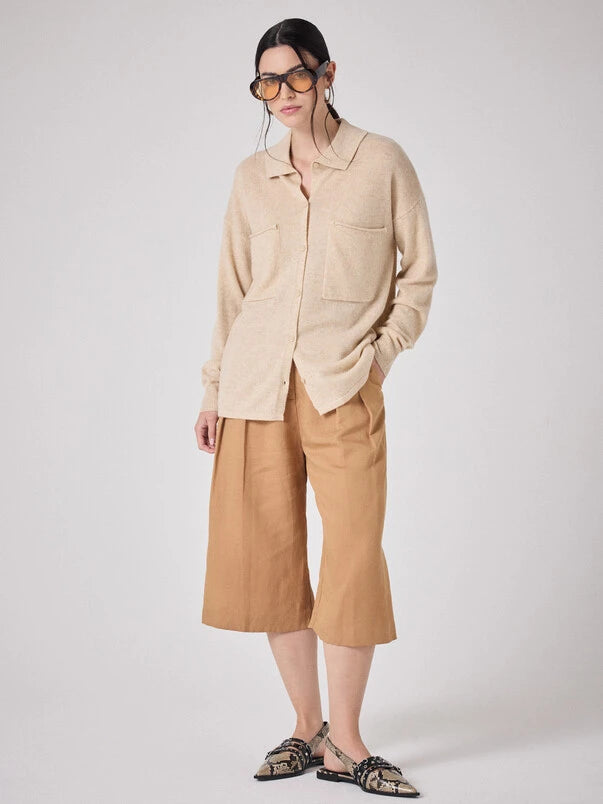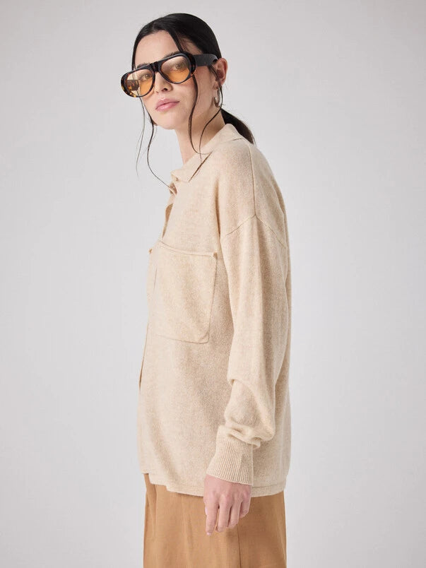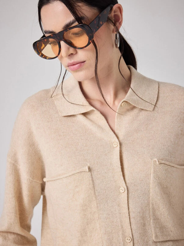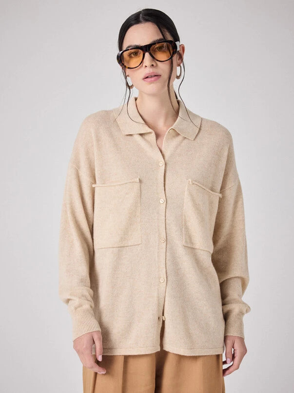 Introducing the Desiree Cashmere Shirt by Notshy. Crafted from 100% cashmere, this luxurious shirt boasts a straight cut, ribbed finishes, and tone-on-tone buttons. Perfect for sophisticated and exclusive wardrobes, this shirt also features 2 front patch pockets for added practicality. Elevate your style with this elegant and tasteful long-sleeve cashmere shirt.