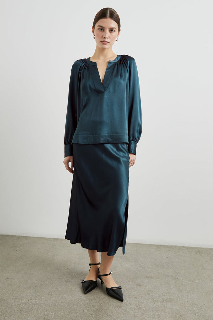 Indulge in luxury with the Wynna Top in Deep Sea. Made from satin crepe, this refined long-sleeve boasts a henley-style placket and elegant ruching around the neck for the perfect fit. Versatile and sophisticated, the Wynna adds a touch of sophistication to any outfit.