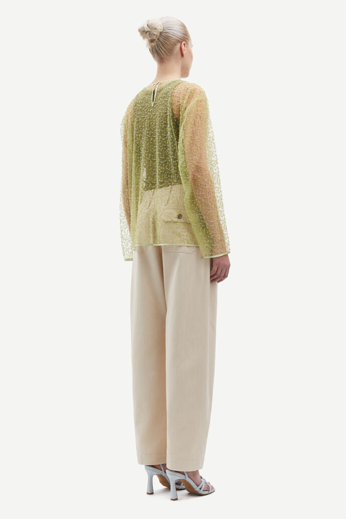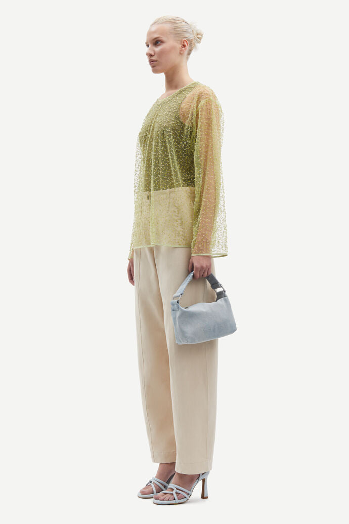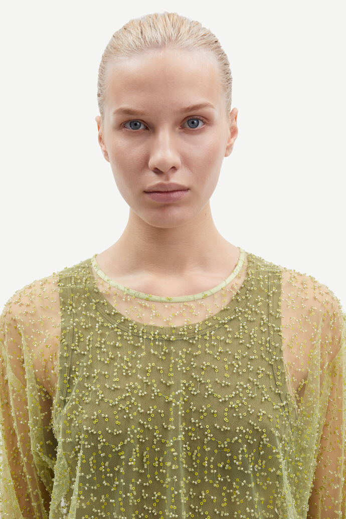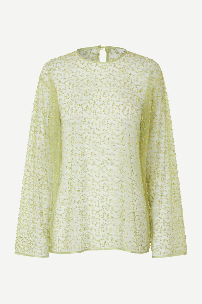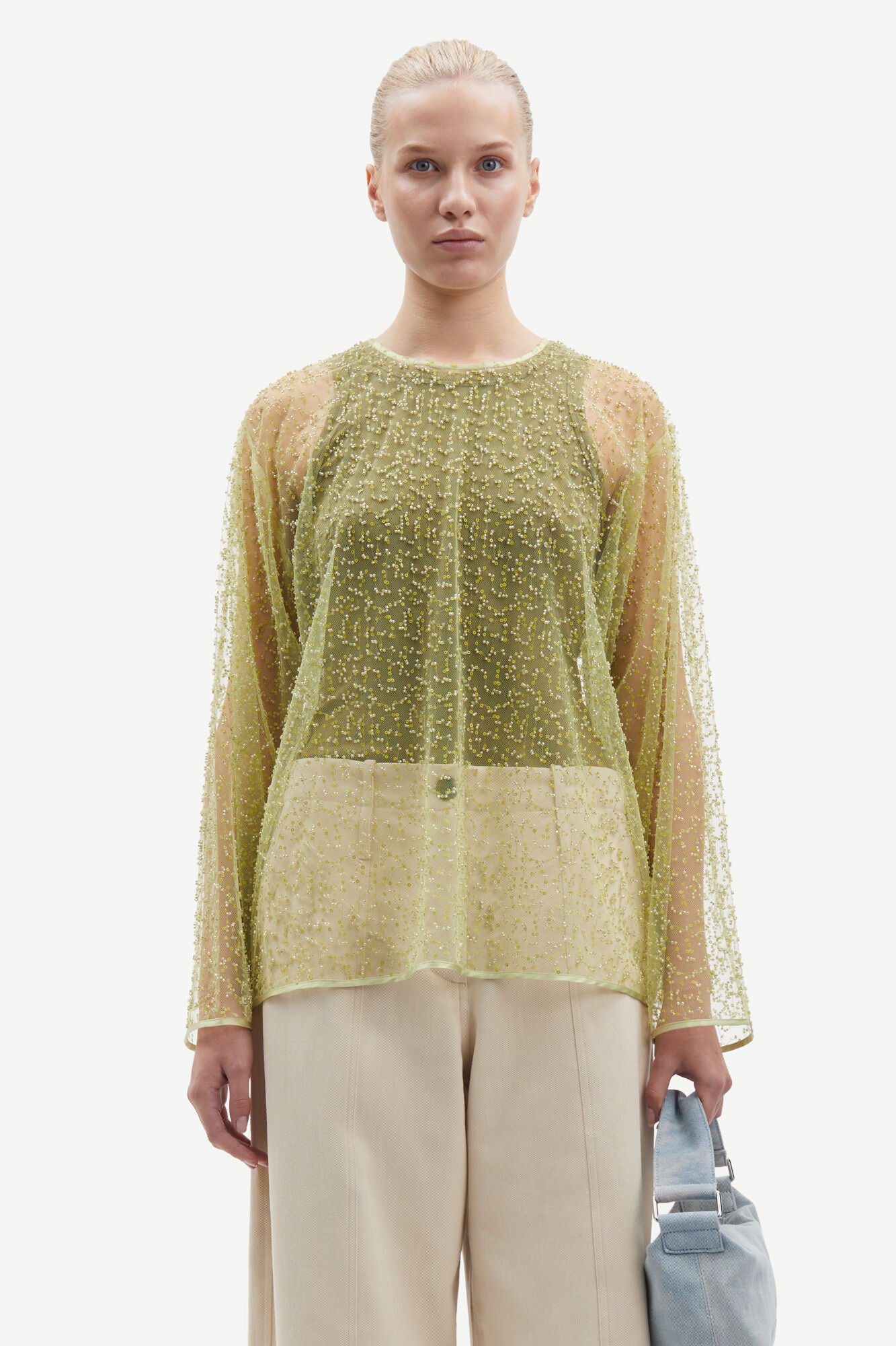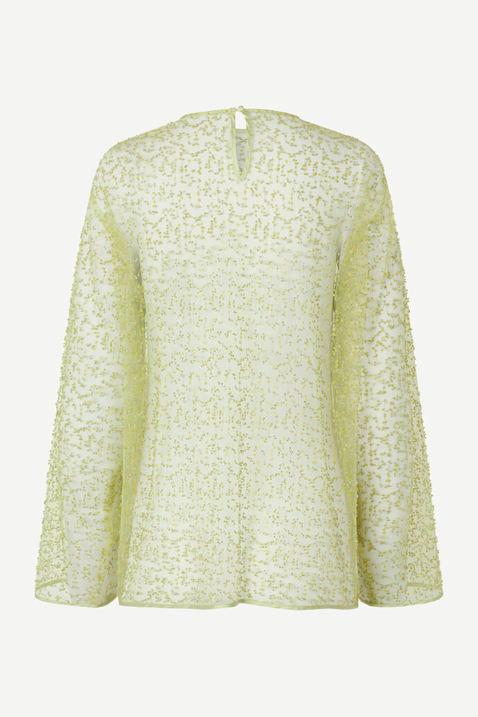Elevate your wardrobe with Samsøe Samsøe‘s Smally Blouse. Crafted from a blend of recycled polyester, this long-sleeved sheer top boasts a regular fit and a button and loop closure at the back. Adorned with recycled sequins and beads, it exudes luxury and sustainability. Made for the conscious fashionista.