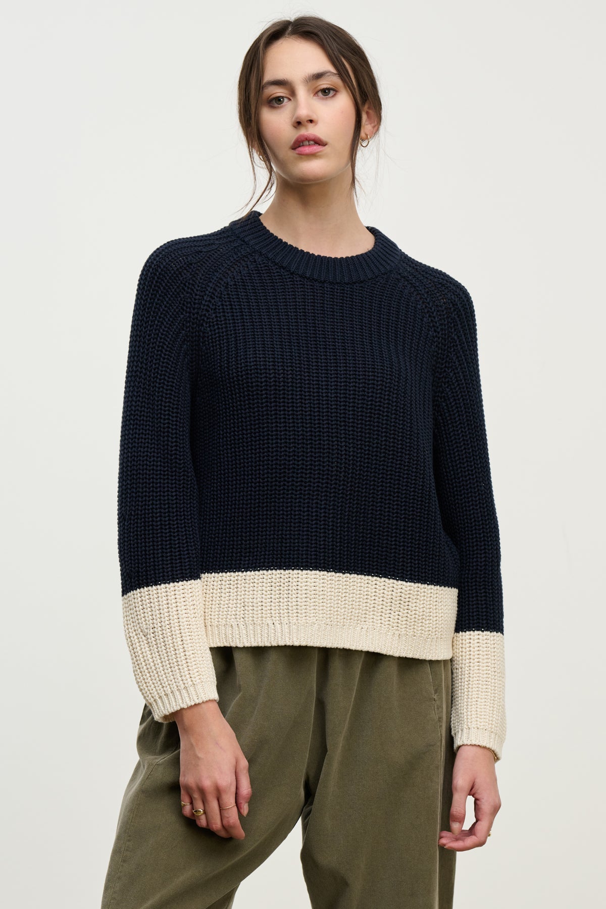 Crafted from chunky Pima cotton with a loose weave, the Shay Chunky Pima Cotton Sweater by Velvet provides exceptional comfort and effortless layering. Its classic crew neckline pairs elegantly with bold color block accents at the sleeve cuffs and hem, adding a refined, contemporary edge to your wardrobe. Ideal for those who appreciate both warmth and style in a versatile, sophisticated piece.