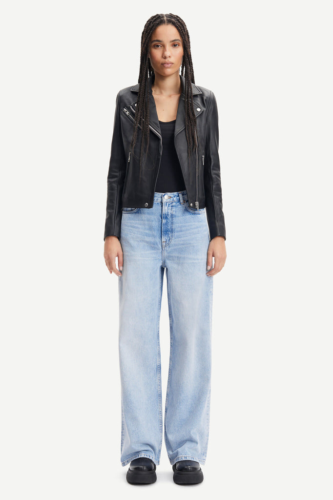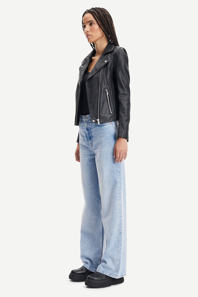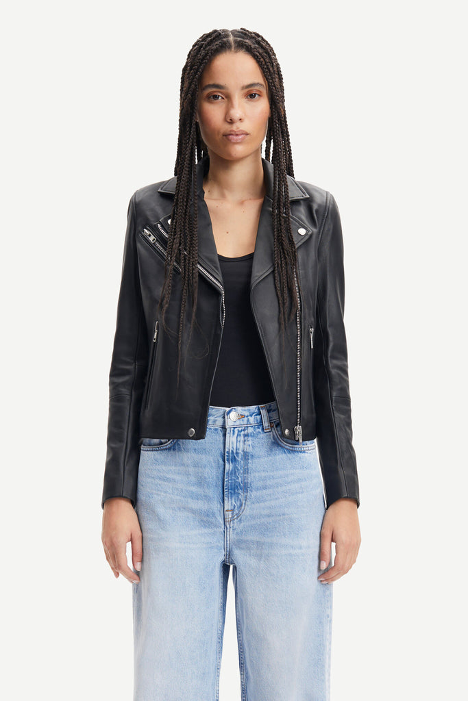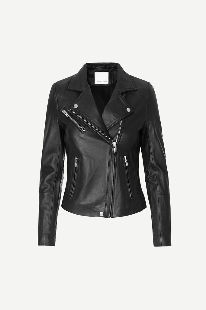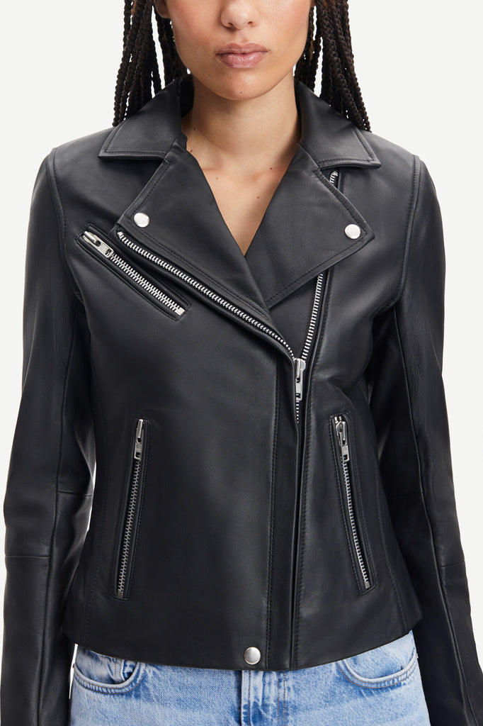 Samsøe Samsøe's, Duris Jacket captures the zeitgeist with this leather biker jacket, a guaranteed style statement, enhanced with chunky metal hardwear for directional appeal. This biker jacket has been cut from soft leather and is fully lined. Bold metal zips asymmetrically fasten the front and pockets, giving a tough edge to this panelled, black leather biker jacket.