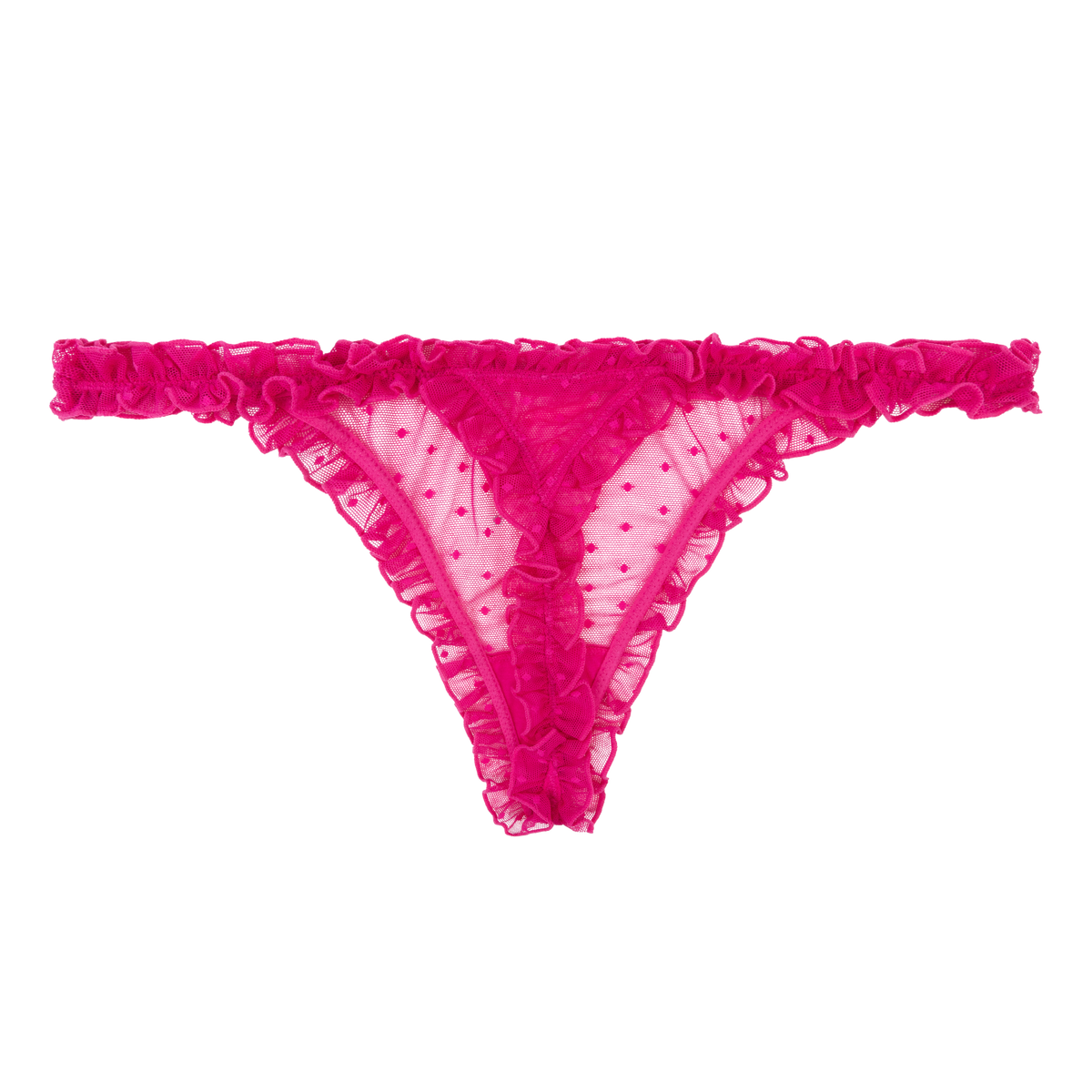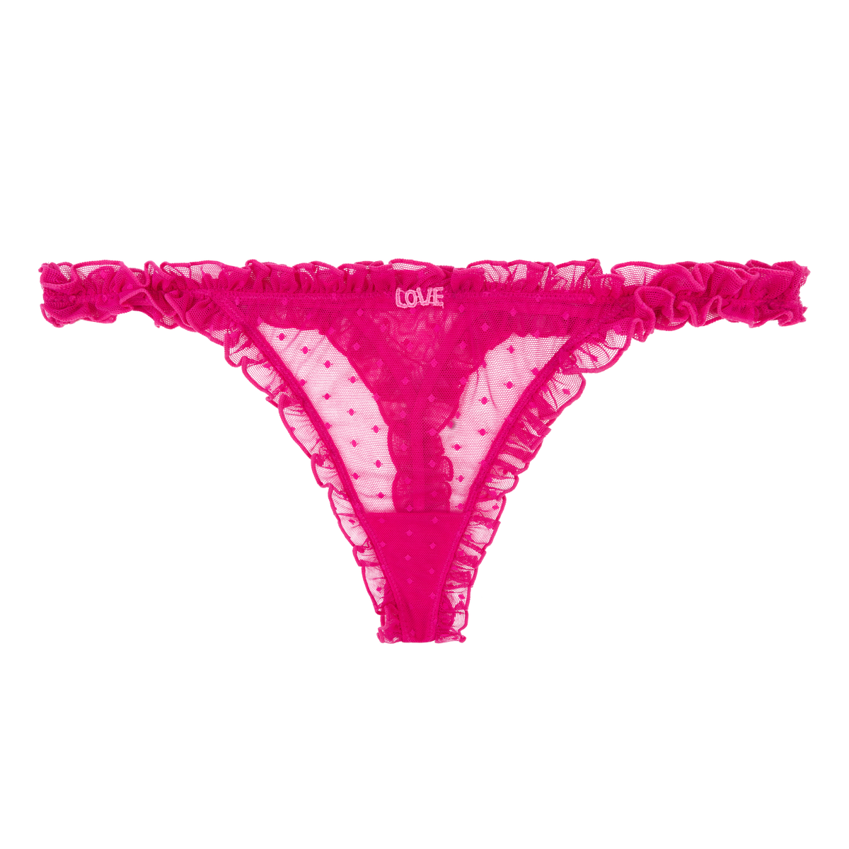 Love Stories experience comfort and luxury with Lana Elegant String Briefs. Soft stretch mesh and ruffled trims lend a sophisticated air, while a hint of romance is provided by the Love applique detail. This thong style is cut with a 100% cotton gusset liner for breathability and comfort, making these briefs the perfect choice for a truly luxurious lingerie experience.
